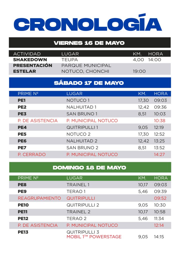 El día sábado se disputarán los primeros 7 tramos de competencia. Todo comenzará con los 17.30 kilómetros de Notuco 1, para luego dar paso a Nalhuitad 1 (12.42 KM), San Bruno 1 (8.51 KM), Quitripulli 1 (9.05 KM), Notuco 2 (17.30 KM), Nalhuitad 2, (12.42 KM) y San Bruno 2, (8.51 KM).