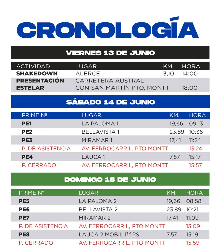 Todo comenzará el día viernes con el Shakedown en el sector El Alerce en Puerto Montt, cuando a partir de las 14:00 horas se realicen los primeros 3.10 KM de prueba no cronometrados. Posteriormente, se hará la tradicional presentación estelar en Carretera Austral con San Martín, Puerto Montt a las 18:00 horas.