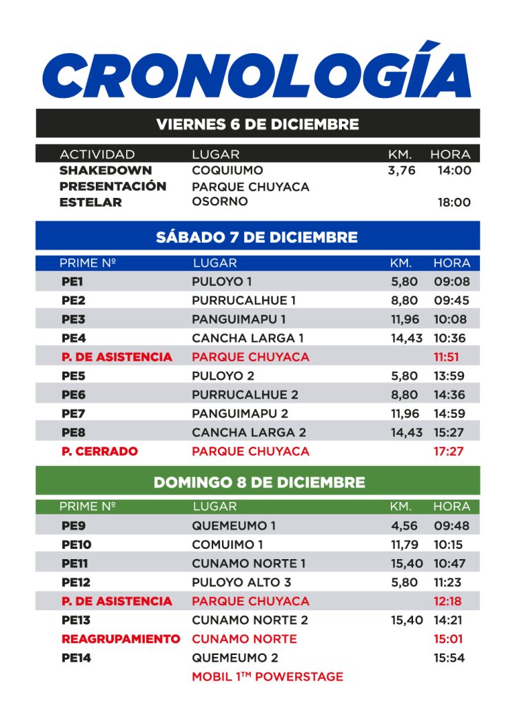 En cuento al cronograma de esta última fecha, todo arrancará el día viernes a las 14:00 horas con el tradicional Shakedown (3,76km cronometrados pero no puntuables para la carrera), para posteriormente realizar la presentación estelar en el Parque Chuyaca, mismo lugar en el que se encontrará la asistencia.